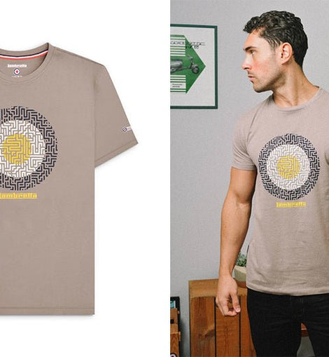 🎨 Un Clásico Reinventado El diseño "Target Geo" es una obra de arte moderna. Toma la forma del símbolo más reconocible de Lambretta y lo transforma con un intrincado patrón geométrico, creando un efecto visual hipnótico y sofisticado. El sutil color arena de la camiseta hace que el logo dorado resalte, logrando un equilibrio perfecto entre elegancia y vanguardia.