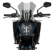 Estética "Ready to Race" Puig ha logrado integrar una cúpula touring sin romper la estética radical de la KTM Duke. Su figura central plana mejora la visibilidad a través de la pantalla, mientras que los laterales se ajustan milimétricamente a los intermitentes y al faro LED, pareciendo una extensión natural de la carrocería de la moto.
